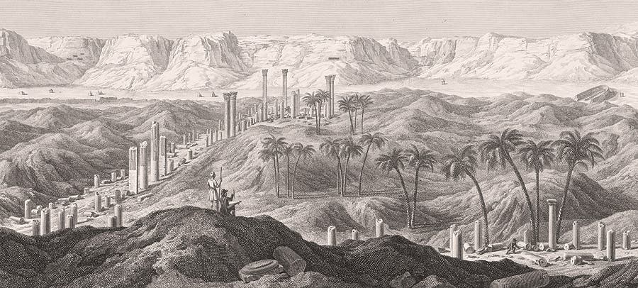 The Commission made a careful survey of Antinoë, which was built by the Emperor Hadrian in memory of Antinous, who drowned himself on this spot. One of the engineers holds a surveyor’s rod, which was used to measure off distances. Image source: Napoleon I, (Edme-François) Jomard, and Jean-Baptiste-Joseph Fourier. Description de l’Egypte: ou, Recueil des observations et des recherches qui ont été faites en Egypte pendant l’expédition de l’armee Française. Antiquités planches, vol. 4, A Paris: De L’Imprimerie impériale, 1809-1828, pl. 54.