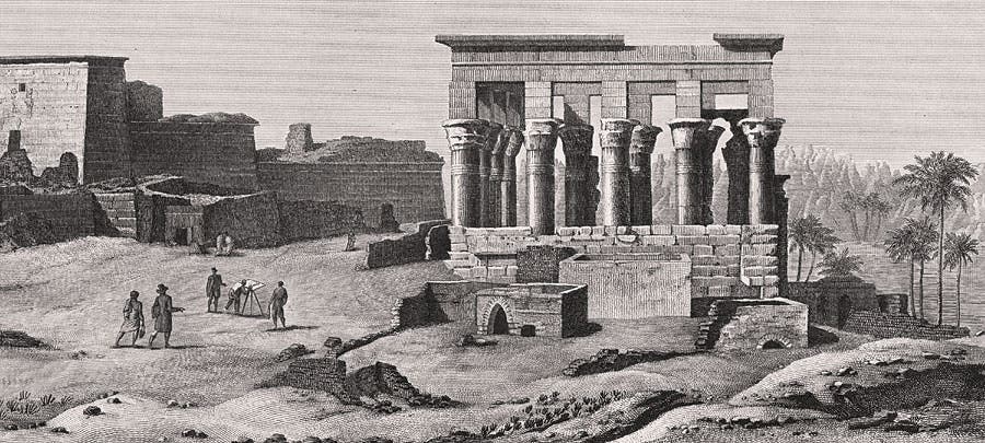 The engineers and artists of the Commission of Sciences and Arts appear frequently in the views of antiquities that were published in the Description de l'Égypte. In this detail from a much wider view, several artists can be seen, leaning over their sketching tables, drawing the Kiosk of Trajan on the isle of Philae. Vivant Denon so loved this monument that he wanted to take it back to France. Image source: Napoleon I, (Edme-François) Jomard, and Jean-Baptiste-Joseph Fourier. Description de l’Egypte: ou, Recueil des observations et des recherches qui ont été faites en Egypte pendant l’expédition de l’armee Française. Antiquités planches, vol. 1, A Paris: De L’Imprimerie impériale, 1809-1828, pl. 25.
