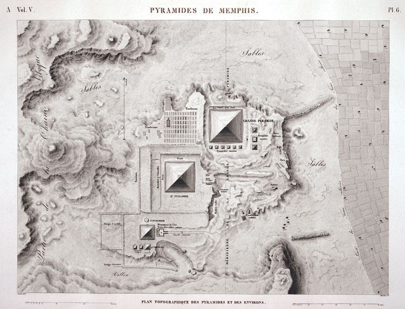 The French engineers carefully mapped the layout of the Giza complex. The Great, or “Grande” Pyramid is not only the largest but also the closest to Cairo. The Second and Third Pyramids are each successively more distant. The Great Sphinx was half buried in the sand and is located in the causeway that leads to the Second Pyramid. Image source: Napoleon I, (Edme-François) Jomard, and Jean-Baptiste-Joseph Fourier. Description de l’Egypte: ou, Recueil des observations et des recherches qui ont été faites en Egypte pendant l’expédition de l’armee Française. Antiquités planches, vol. 5, A Paris: De L’Imprimerie impériale, 1809-1828, pl. 6.