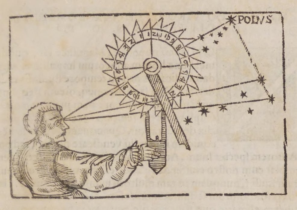 Woodcut showing how to use a nocturnal dial. Image source: Apian, Peter, et al. Cosmographia, siue Descriptio uniuersi orbis. Antuerpiae: Apud Ioan. Bellerum, ad insigne Aquilae aureae, 1584, p. 192.