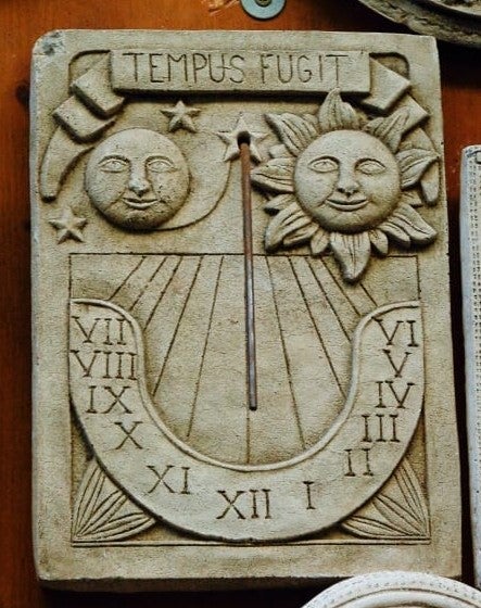 The Latin motto “Tempus fugit.” (“Time flees.”) which appears on this sundial is derived from a line in Virgil’s Georgics.