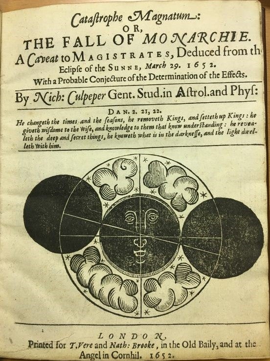 Eclipses fascinated people from all walks of life. Ordinary men and women had their own ways of interpreting these and other astronomical events. Eclipse images appear on the title pages of works like Nicholas Culpeper’s Catastrophe Magnatum, or, The Fall of Monarchie, and William Lilly’s Annus Tenebrosus, or the Dark Year. Culpeper and Lilly were astronomers, and their publications discuss the solar eclipse of 1652, visible over the British Isles, and popularly known as “Black Monday.”