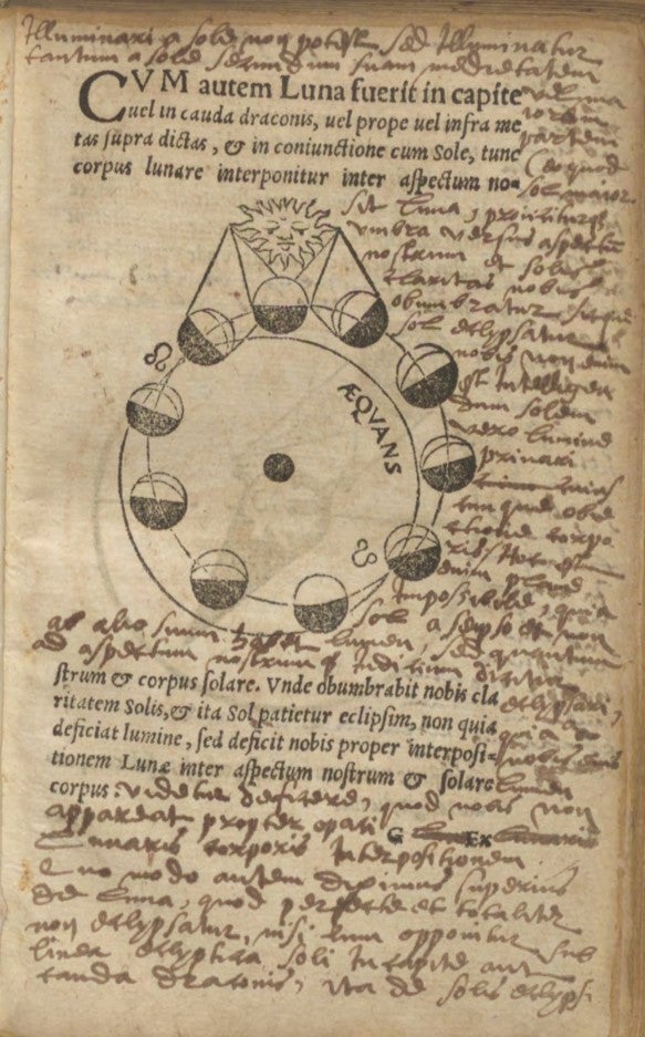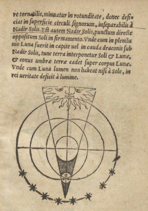 Cum autem Luna fuerit in capite uel in cauda draconis, […], tunc corpus lunare interponitur inter aspectum nostrum et corpus solare. Unde obumbrabit nobis claritatem Solis, et ita Sol patietur eclipsums, non quia deficiat lumine, sed deficit nobis proper interpositionem Lunae inter aspectum nostrum et solare corpus.