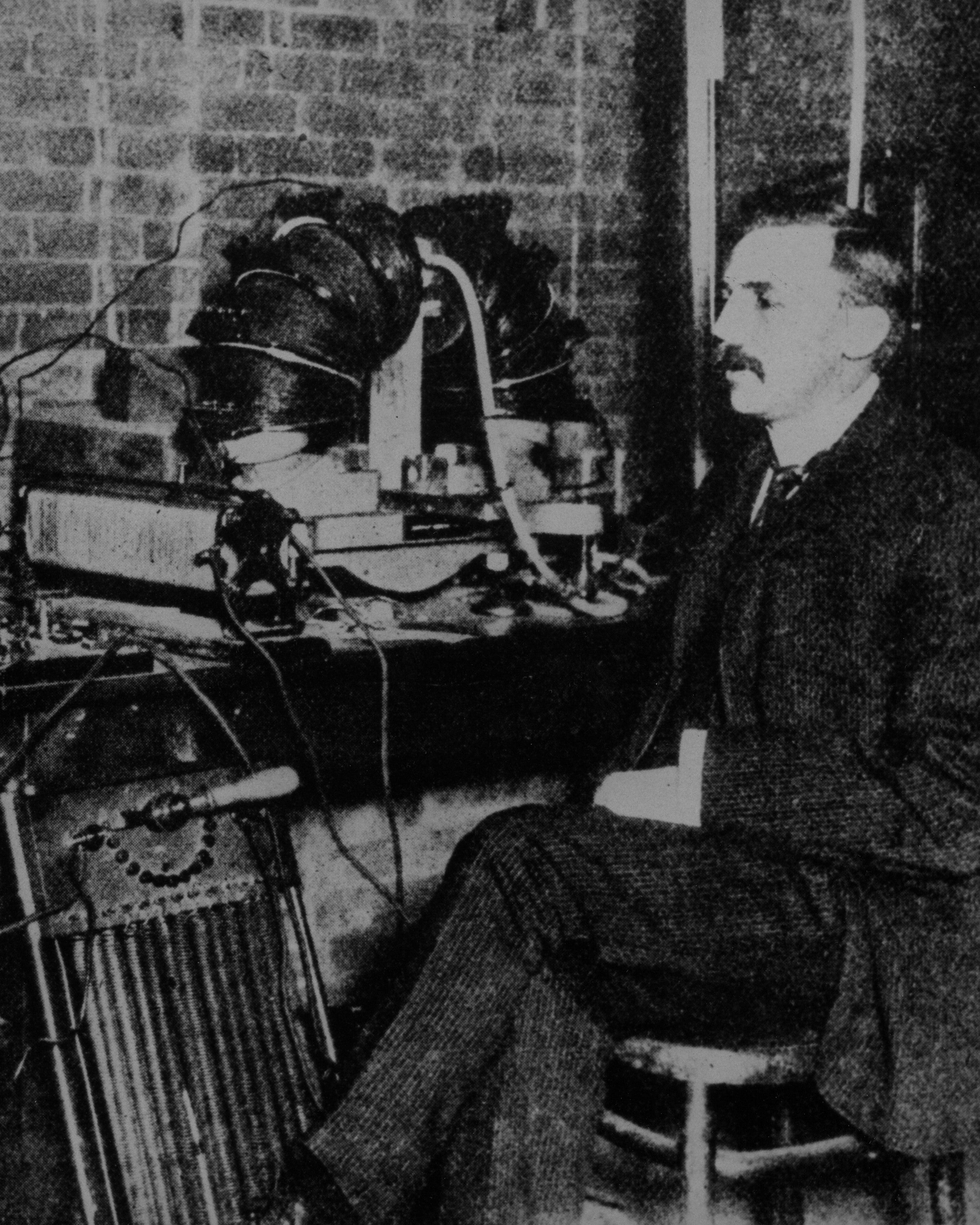 Image source: Robert Millikan and G. Harvey Cameron with early cosmic ray electroscopes, lead shielding, batteries, and voltmeter. AIP Emilio Segrè Visual Archives General Collection.